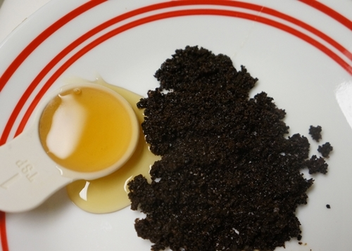 - Trộn bã cà phê với dầu mè, dầu oliu thành hỗn hợp sệt.
